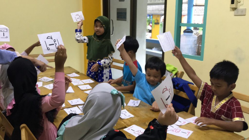 บทที่ 12 ครั้งที่ 1(1/2) ดาอีเอื้อเฟื้อ จุดประสงค์ ให้เด็ก ๆจำพยัญชนะไทย 44 ตัวได้ กิจกรรม .เริ่มเรียนด้วยการกล่าวดุอา ร้องเพลงสระในภาษาไทย ร้องเพลงอักษรกลาง อักษรสูง การอ่านแจกรูปสระ ที่เรียนมาแล้วทั้งหมด โดยคุณครูทำเป็นแผ่น chart ขึ้นมาเพื่อให้นร.สามารถทบทวนสระทุกสระได้ทุกชม.ในเวลาที่รวดเร็วคุณครูบอกชื่อสระที่จะเรียนวันนี้พร้อมทั้งอธิบายว่าแต่ละสระประกอบด้วยสระอะไรบ้าง